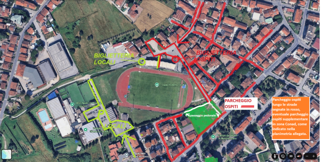 INFO TIFOSI LOCALI: Per quanto riguarda i tifosi locali invece sarà adibito il lato destro della tribuna coperta, con ingresso e biglietteria dedicati. Il parcheggio per i tifosi locali sarà quello della piscina comunale, posta in via Sandro Pertini.“