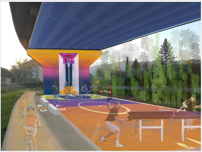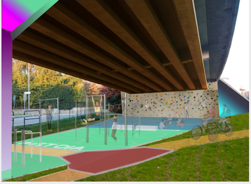 In quello che sarà chiamato il “Giardino degli studenti”, posto nello spazio sottostante le campate del ponte, è prevista l’installazione di attrezzature ludico-sportive: parete per arrampicata, attrezzi per la callistenia, superfici per il calcetto e il basket e tavoli da ping-pong. La nuova area ricreativa è pensata per una fascia di età adolescenziale e questa soluzione consente di valorizzare uno spazio altrimenti inutilizzato e degradato e vuole essere un invito a vivere il nuovo parco. Sfruttando il ritmo dei piloni del ponte, l’area verrà suddivisa in quadranti dedicate alle diverse discipline; tutto al coperto e al di fuori dei rumori e del traffico.