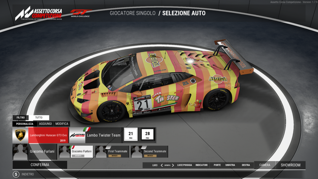 La rinvigorita, dopo l’ultimo aggiornamento del gioco, Porsche sarà a disposizione del Team Risi e Bisi di Alfonso Giordano e Maurizio Farsura e del Team Liuk di Carlo D’Orazio e Andrea Adolfini. Leonardo Porco sarà invece al volante della Lamborghini nel team Lambo Twister assieme a Giacomo Furlani. La seconda Huracan sarà poi portata in pista dal duo No Free Overtakes Francesco Frate e Giuseppe Robbiati.
