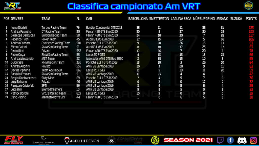 La settimana conclusiva di questi campionati di fine 2021 sullo storico tracciato di Suzuka partirà martedì 7 dicembre, con Platinum e Gold in pista. Con entrambi i titoli in ballo, non ci sono dubbi che sarà un evento molto atteso. Giovedì 9 toccherà a Silver e Bronze, con Cici e Pasquinelli ad un passo dalla vittoria finale ma senza possibilità di distrazioni su una pista vecchio stile come quella giapponese. Concluderanno i campionati GT3 AM e Beginners martedì 14, con molta incertezza nei primi e un Ballan vicino all’affermazione nei secondi.