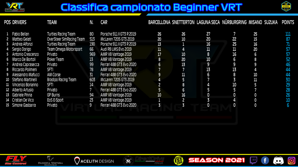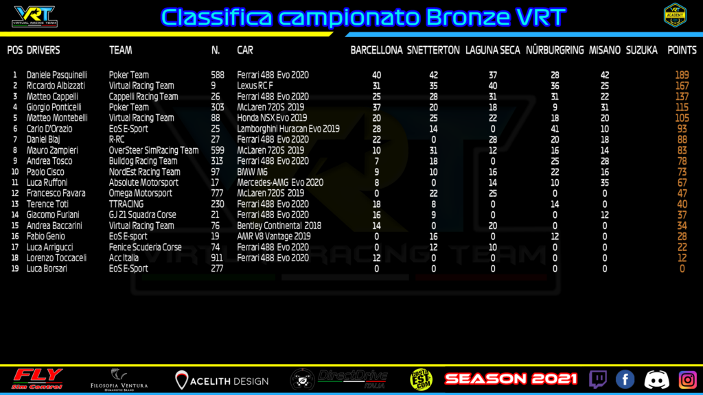 Il terzo al traguardo, Andrea Tosco, ha infatti causato un brutto incidente in avvio ed ha ricevuto una penalità di ben 30 secondi, finendo subito dietro a Ponticelli. Un vero peccato per Tosco, che aveva ben usufruito della forma della Ferrari, tra le vetture più in palla sul circuito romagnolo assieme a Bentley ed Aston. Solo quinto in categoria Riccardo Albizzati, in rimonta dopo una prima fase da dimenticare in cui ha subito a sua volta una penalità, seppur di 10 secondi. Riccardo non è lontanissimo in classifica campionato da Pasquinelli (22 punti), ma a Suzuka dovrà sperare in una serata perfetta e in una contemporanea crisi del rivale. Sul circuito giapponese mai dire mai, però, insieme a Silver e Beginners, la Bronze sembra tra le classi più in naftalina. Ci saranno sorprese dietro l’angolo?