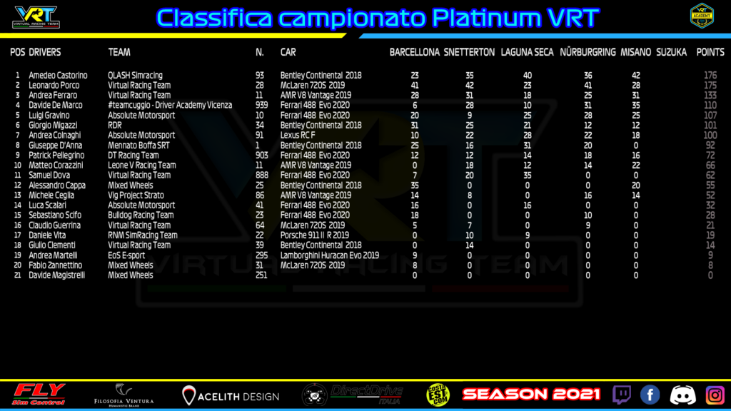 Un solo punto decide al momento il campionato VRT Platinum. Amedeo Castorino infatti coglie il secondo successo stagionale e artiglia la leadership in campionato sfruttando la serataccia di Leonardo Porco. Amedeo, più che mai a suo agio con la Bentley sul bagnato, ha sfruttato al meglio la pole position scappando dal caos scatenatosi nelle prime battute di gara.