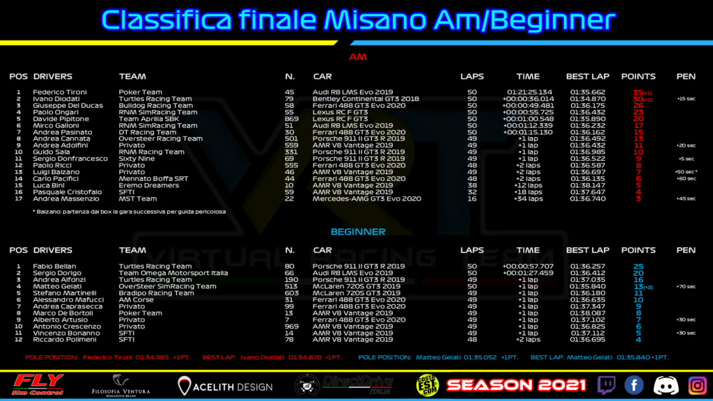 Negli AM subisce una penalità di 15 secondi Diodati, ma non perde posizioni rispetto all’ordine d’arrivo. Costa caro il caos in avvio a Gelati nei Beginners, a cui vengono aggiunti ben 70 secondi. Dorigo guadagna dunque una posizione, mentre il terzo gradino va ad Andrea Alfonzi, che si rilancia nella lotta per la piazza d’onore. Bellan, grazie alla penalità di Gelati, ha praticamente in mano il titolo: gli basterà giungere al traguardo a Suzuka.