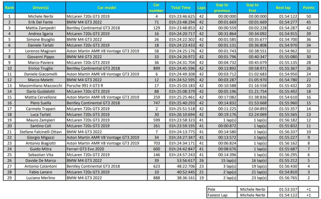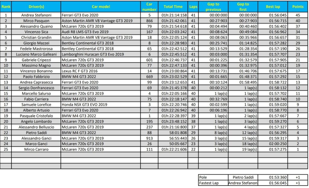 Ha trionfato infine nella Class 3, non coperta dalla diretta sul canale Twitch del VRT, Andrea Stefanoni su Ferrari. Andrea, a sua volta autore di una bella rimonta, ha preceduto di quasi 28” Mirco Pasquon su Aston Martin. Terzo Alessandro Quaino, che ha preceduto Vincenzo Sica di 8,6” e Christian Grandin di poco più di 16. Ritirato nell’ultimo quarto d’ora di gara il poleman Pietro Saddi che stava provando a recuperare la leadership persa.