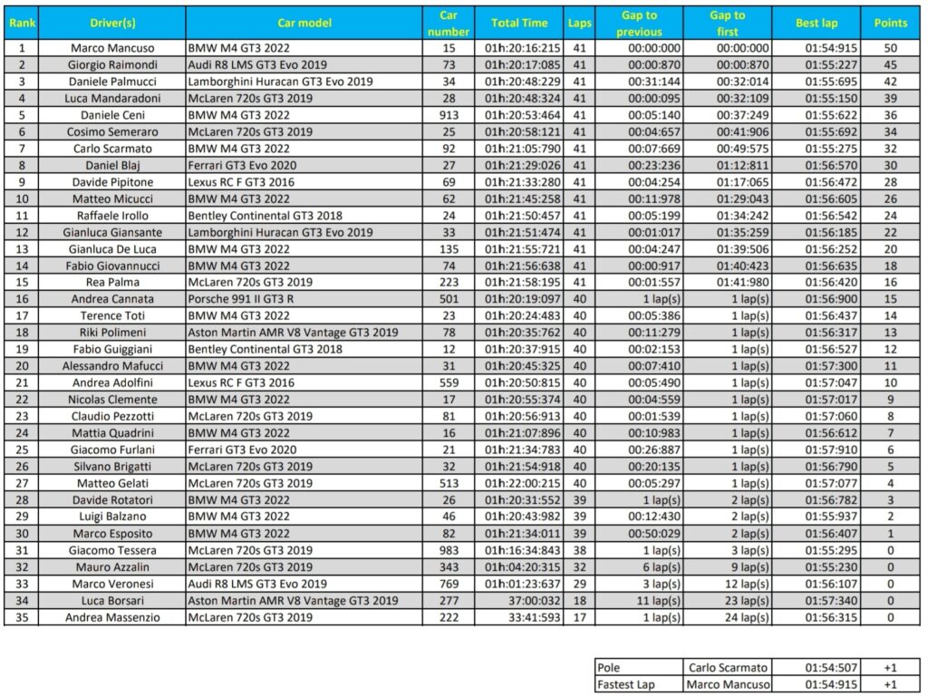 Ha completato il podio di serata Daniele Palmucci su Lamborghini, vincitore della seconda volata di serata. Palmucci infatti ha avuto la meglio di Luca Mandaradoni per soli 95 millesimi, un vero e proprio battito di ciglia. Una giusta ricompensa per una gara in cui Daniele non ha lasciato spazi né per Luca né per gli altri due rivali Giacomo Tessera e Mauro Azzalin, ritiratosi nel finale dopo due incidenti. Visti i tanti duelli e le grandi battaglie, la sensazione è che la Class 2 possa rivelarsi la più equilibrata ed incerta della stagione. Ad Imola ne sapremo senz’altro di più.