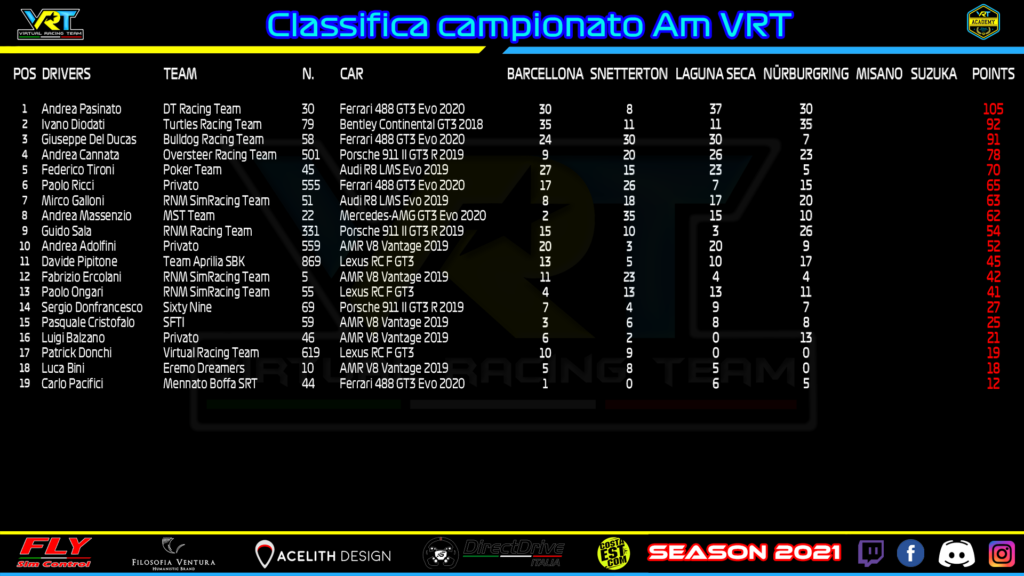 Questo martedì 23 novembre il VRT tornerà virtualmente in Italia: sarà infatti Misano la quinta e penultima tappa dei campionati GT3. Con tante categorie ancora apertissime (in primis Gold, Bronze e AM) il round romagnolo si preannuncia ricco di suspense e vietato a facili pronostici. La pista poi, per la sua natura mista, si presterà senza dubbio a difficili compromessi nel set-up e a duelli aspri con poche chance di sorpasso. Inizieranno come sempre Platinum e Gold, con Silver e Bronze che saranno pronti giovedì 25. Chiusura del programma con AM e Beginners martedì 30. Tutte le gare saranno trasmesse in diretta alle ore 21:30 circa sul canale ufficiale del VRT