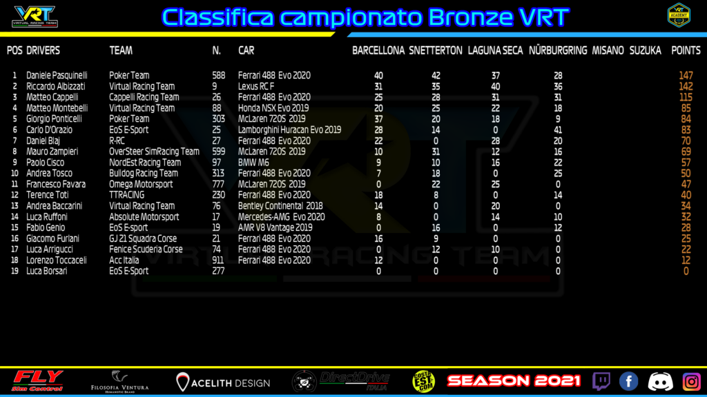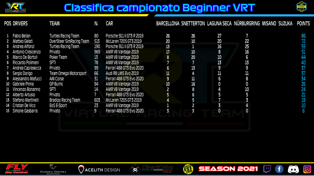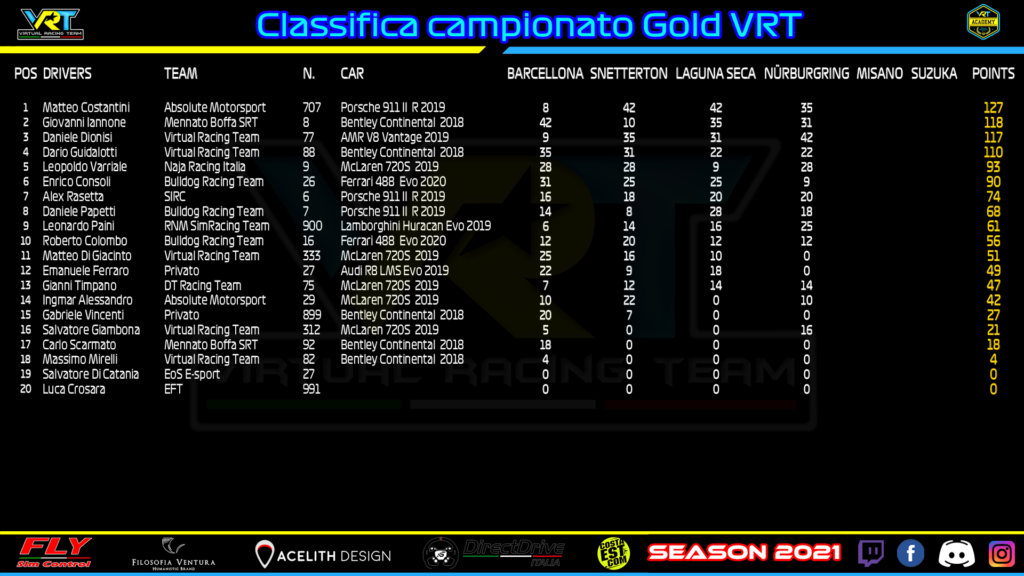 Dietro di lui è giunto il rivale per il titolo Giovanni Iannone, passato al terzo posto dopo la penalità di 15 secondi inflitta ad Leopoldo Varriale. Una disdetta per il simracer su McLaren vista l’ottima prima parte di gara, poi rovinata da un contatto nelle fasi finali. In classifica i giochi sono più che mai aperti, con Costantini, Iannone, Dionisi e Dario Guidalotti racchiusi in soli 17 lunghezze.