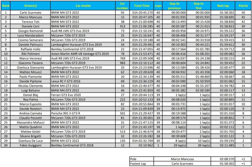 Mancuso si consola con la difesa della leadership in campionato, con 19 lunghezze di vantaggio sullo stesso Scarmato. Entra invece in top 10 Terence Toti, che ha completato il podio di Silverstone dopo la bella lotta col vincitore in avvio di corsa. Quarto è giunto Daniele Ceni, anche lui nella bagarre BMW dei primi giri, che ha riscattato l’amaro ritiro per incidente ad Imola. Dietro di lui la prima non BMW, l’Audi di Giorgio Raimondi, che mantiene comunque il podio provvisorio nella classifica di Class 2.