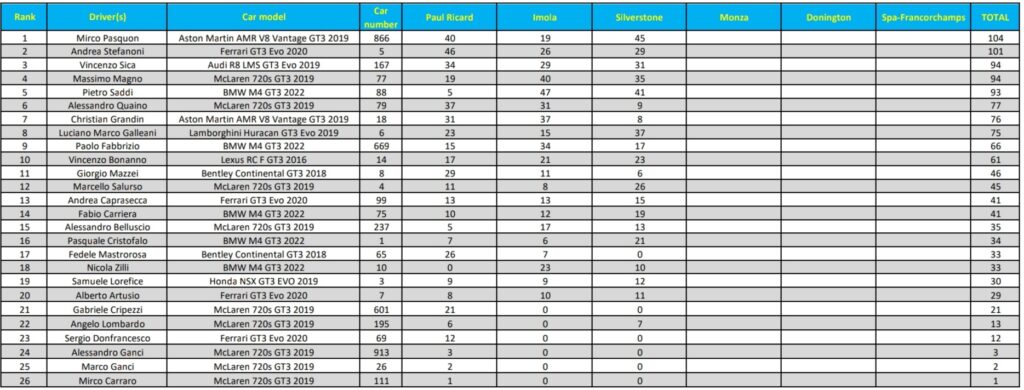 La prima vittoria nella Class 3 ha permesso a Pasquon d’issarsi al comando della classifica dopo la prima metà di stagione. A sole tre lunghezze c’è Andrea Stefanoni, sesto nella serata di Silverstone. Davanti a lui, in quinta piazza, ha chiuso Vincenzo Sica, terzo in campionato. Saddi, nonostante la delusione dell’affermazione sfumata, entra ufficialmente in Top 5.