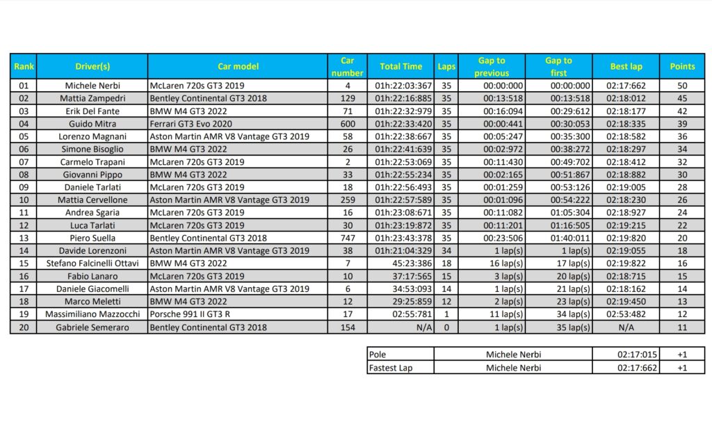 La Class 1 si è chiusa così come si era avviata lo scorso inverno: con una vittoria di Michele Nerbi. Spinto da una McLaren in formissima, Michele ha fatto letteralmente hat trick, con pole, vittoria e giro più veloce. Una prestazione maiuscola che ha permesso a Nerbi di mettere la piazza d’onore in graduatoria al sicuro dagli attacchi di Mattia Zampedri, giunto secondo a Spa con un distacco di circa 13”. Una gara comunque ottima per Mattia, meritatamente al terzo posto in campionato nonostante una Bentley ridimensionata dal BoP invernale. Ha chiuso il podio Erik Del Fante, che col titolo in tasca non ha potuto ottenere il sigillo finale per una BMW non così sugli scudi come negli scorsi round.