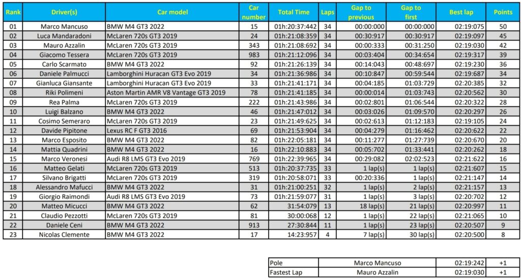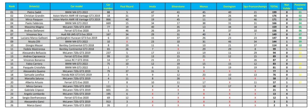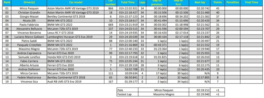 A Spa ha trionfato Mirco Pasquon su una rediviva Aston Martin, col compagno di marca Christian Grandin in seconda posizione a 15”. Grandin ha chiuso in piazza d’onore anche il campionato, precedendo lo stesso Pasquon che ha pagato le tappe amare di Imola, Monza e Donington. Ha chiuso il podio, non molto distante da Grandin, Giorgio Mazzei su una finalmente in palla Bentley. Il terzo posto ha permesso a Giorgio di arpionare la top 10 e quindi la qualificazione alla Platinum Final di giovedì 2 giugno.