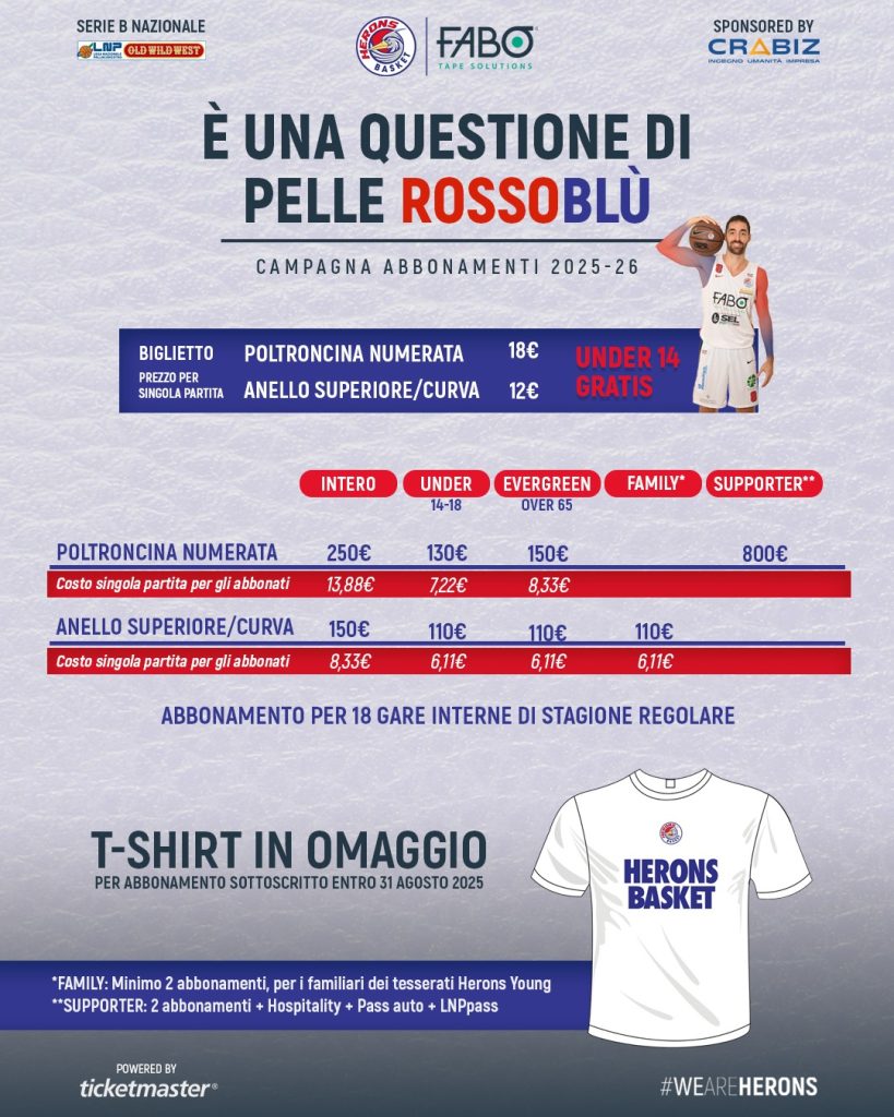 Chi sottoscriverà l’abbonamento entro il 31 agosto riceverà in omaggio una t-shirt personalizzata “HERONS BASKET” powered by Crabiz! Inoltre prima ti abboni, più possibilità hai di scegliere il tuo posto. Non aspettare: assicurati ora il tuo posto preferito al Palatagliate e al Palaterme.