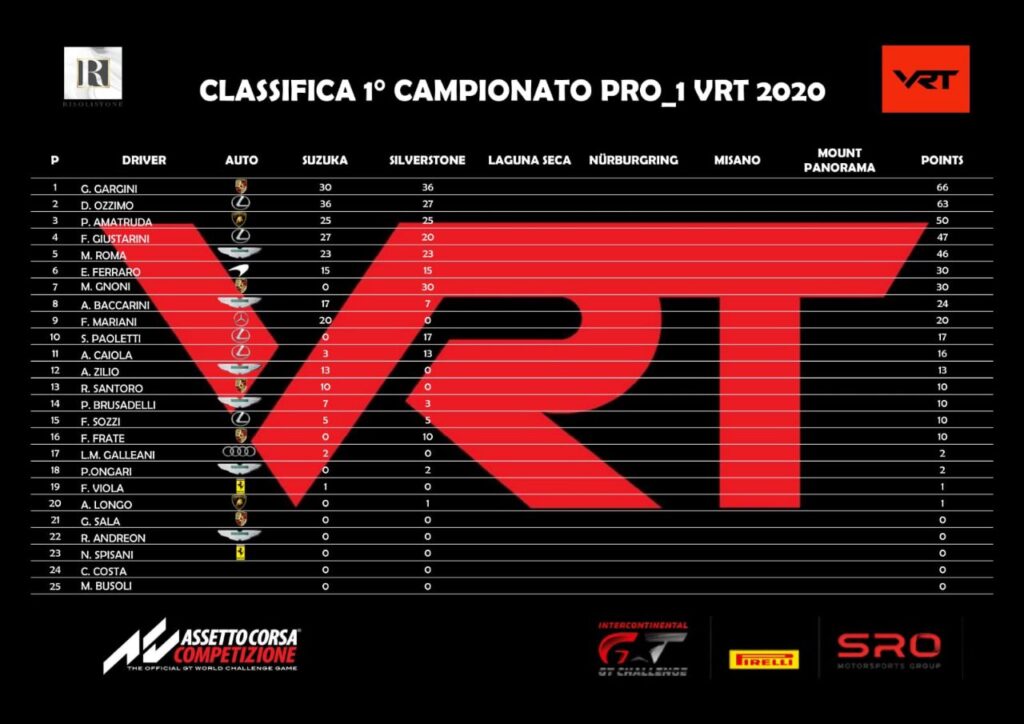 Dopo due eventi c’è molta incertezza nella Pro1. Gargini ha guadagnato la leadership dopo il successo a Silverstone, ma Ozzimo è solo a tre punti di distacco. La sua voracità dimostrata nella rimonta dopo l’errore in partenza promette spettacolo. Almeno per ora, pare dunque una questione fra loro due. Amatruda con due quarti posti s’è issato al terzo posto, ma dovrà stare attento ai tanti avversari vicini. Tra questi Gnoni, che era assente a Suzuka e che col secondo posto a Silverstone ha già guadagnato la settima posizione.