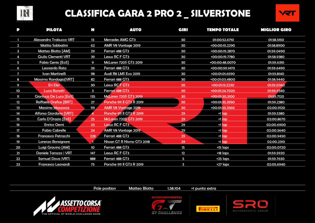 Alessandro Trabucco ha dominato con la sua Mercedes. Partito secondo, Alessandro ha avuto uno scatto fulmineo e ha subito preso il largo, guadagnando ben tre secondi già dopo un giro. Trabucco non ha poi faticato ed ha vinto con 15 secondi sul resto della compagnia, ottenendo la seconda vittoria in due gare. Più combattuta la lotta per la piazza d’onore, dove a spuntarla è stato Mattia Sabbatini su Aston Martin. Mattia, terzo prima del pit stop, è rientrato dietro a Mattia Blotto ma ha recuperato pian piano il distacco. A circa dieci minuti dalla fine Sabbatini ha completato la rimonta, superando il rivale con una manovra decisa nel settore di pista introdotto con la ristrutturazione del 2010.