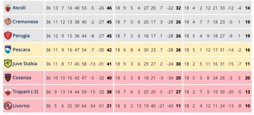 Una stagione positiva se non fosse per il rendimento della squadra: con 38 punti (-2 di penalità, ndr), il Trapani occupa il penultimo posto davanti al solo Livorno, già condannato alla Serie C. I risultati dell’ultimo periodo – a cominciare dal successo sul Pescara – hanno però rimesso in carreggiata la truppa di Fabrizio Castori, che a due giornate dal termine può ancora sperare nei playout.