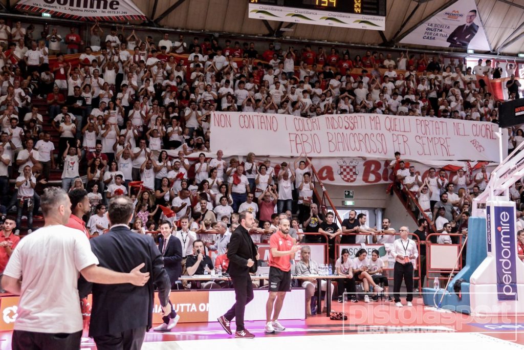 Un attimo di silenzio e gli occhi diventano lucidi. Questa è la reazione di Fabio Bongi in sala stampa quando ripensa allo striscione dedicatogli nel pre-game. “Non importano i colori indossati, ma quelli portati nel cuore. Fabio biancorosso per sempre”. Tanto recitava il drappo appeso dalla Baraonda a pochi minuti dalla palla a due. L’attuale vice allenatore di Trento è passato sotto la curva Pistoia a salutare e ringraziare i tanti (tantissimi) vecchi amici presenti.
