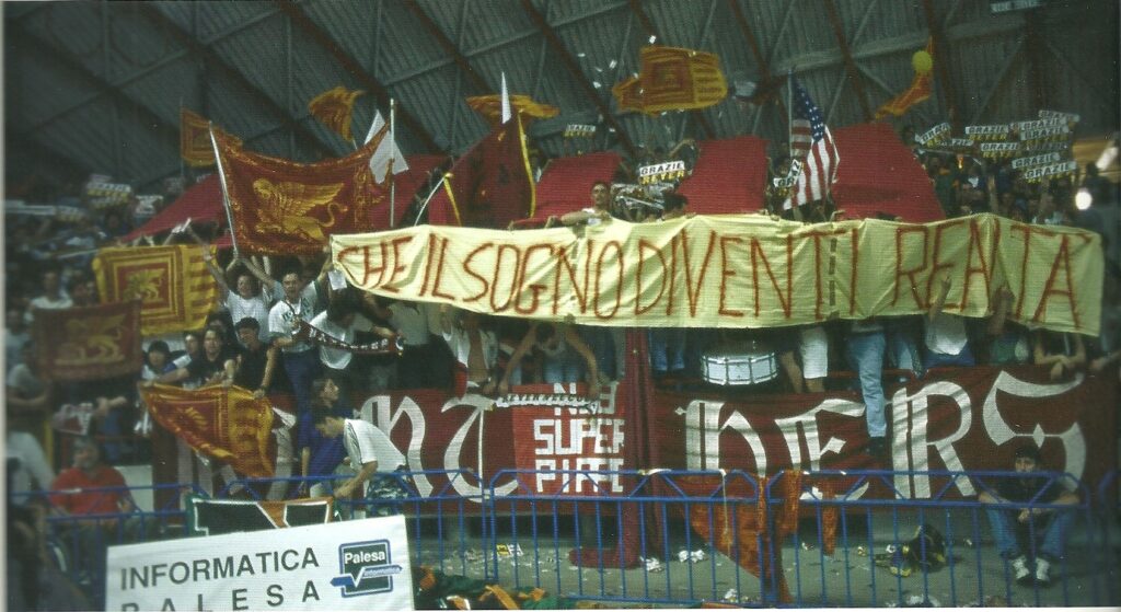 Si dice che Vitucci, veneziano di Cannaregio, studente di Scienze Politiche e allievo prediletto di un certo Paron Zorzi, uno che a nemmeno 30 anni era già primo allenatore della squadra della sua città in serie A, chiedesse ai suoi di recuperare un punto al minuto. Si dice che Steve Burtt, draftato nel 1984 con mezzo futuro Dream Team, giramondo della retina nonostante diverse stagioni in Nba, 192 centimetri e poco più e un caratterino che te lo raccomando, avesse detto ai compagni “se avete paura, date la palla a me”. Con la gestione attenta di Vitucci, Burtt quell’anno riga dritto. In una squadra cementata dall’esperienza di Silvestrin, Mastroianni, Pietrini e forgiata dall’estro di Pippo Cattabiani, il dominatore dei campetti di Harlem, ne mette 31,1 a partita. In quella bella che diventerà bellissima, si supera e tocca quota 41, decisivi per trasformare una gara maledetta in leggenda. La Reyer vince 92- 88, è l’estasi di una città, di gente che col basket ha sfidato la storia (vedi la Reyer che nel 1943 osò battere la Mussolini Roma). Chissà dov’era Carlton Myers, già stella azzurra della Fortitudo, arrivato in tribuna per tifare la sua Rimini, quando l’allora sindaco Massimo Cacciari scendeva negli spogliatoi per brindare con i leoni dei canestri. Chissà in quanti hanno sperato che quel miracolo sportivo potesse cancellare una storia già scritta. 18 miliardi di debito e ripartenza dalla C2. Ma quell’impresa è comunque inestimabile.” Nell’ultima partita riuscimmo a rimontare dal – 18 all’intervallo- chiude Vitucci- con le azioni di 30”, il basket più lento era molto più complicato di oggi. Invece quella vittoria è un fotogramma rimasto sui muri della città”.