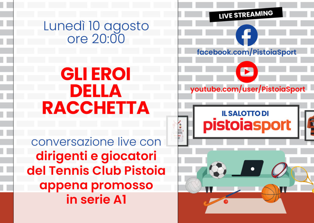 Torna quindi il prodotto multimediale che ha accompagnato gli sportivi durante i mesi del lockdown: sui canali Facebook e YouTube di Pistoia Sport, a partire dalle 20 di questa sera (lunedì 10 agosto), comincerà una diretta che vedrà coinvolti tutti i protagonisti della cavalcata che ha riportato il Tennis Club Pistoia nel massimo campionato.