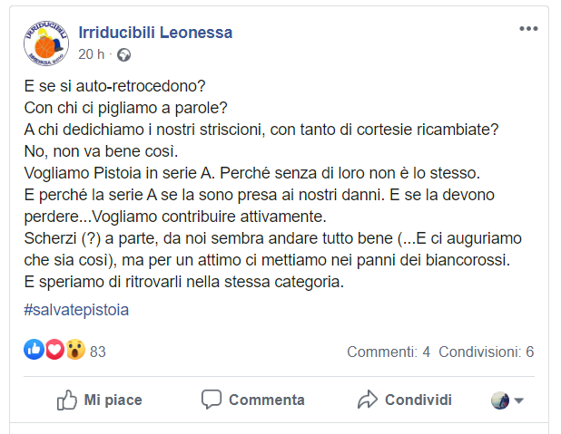 «E se si auto-retrocedono? Con chi ci pigliamo a parole? A chi dedichiamo i nostri striscioni, con tanto di cortesie ricambiate?» è quello che leggiamo sulla pagina Facebook degli Irriducibili Leonessa.