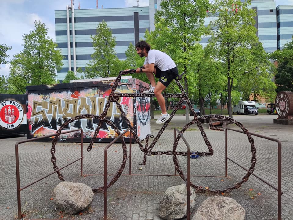 John “in sella” all’installazione artistica a tema ciclistico presso Amburgo
