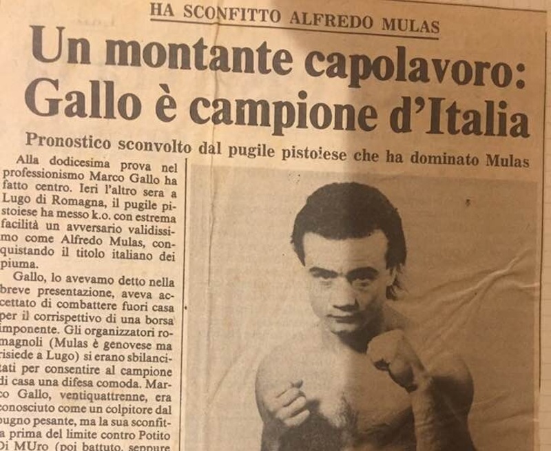 Il 26 marzo 1980 il pistoiese Marco Gallo conquista il titolo italiano nei pesi piuma battendo Alfredo Mulas. Oggi è maestro all’Accademia “Ugo Schiano”