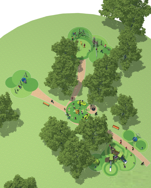 L’area destinata all’attività ludica ha accesso dal vialetto asfaltato che dal parcheggio della villa conduce al bar ed è distinto in quattro zone differenziate in relazione alla loro funzione d’uso, collegate tra loro da un percorso accessibile pavimentato in gomma colata. Le aree saranno distinte in area piccoli (0/6 anni), area altalene, area arrampicata (6/16 anni), area di gioco libero.