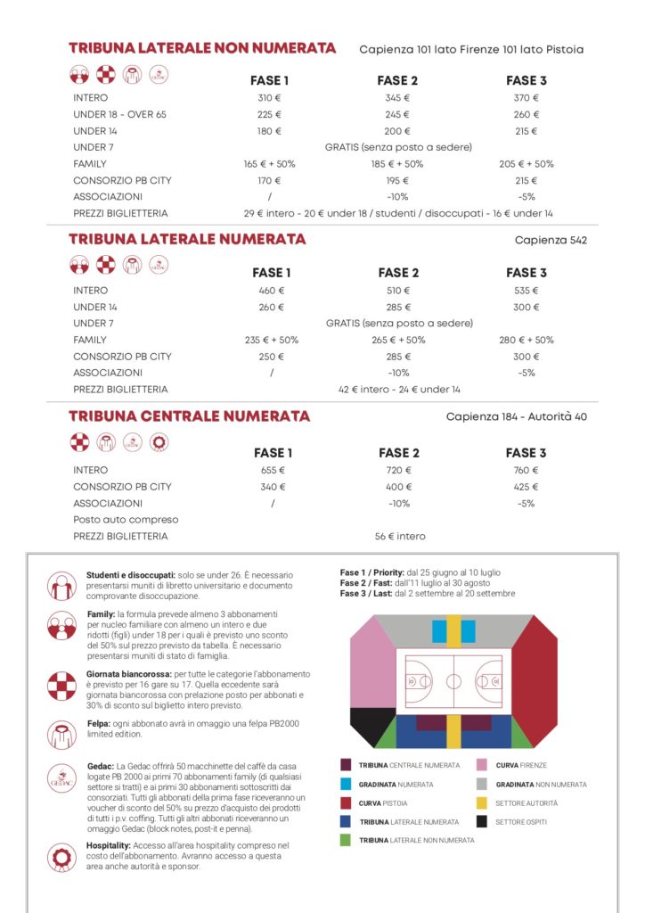 Sarà possibile rinnovare o sottoscrivere (dall’11 luglio) l’abbonamento al PalaCarrara dal lunedì al sabato dalle 17 alle 20, con un apposito spazio allestito in sala stampa.