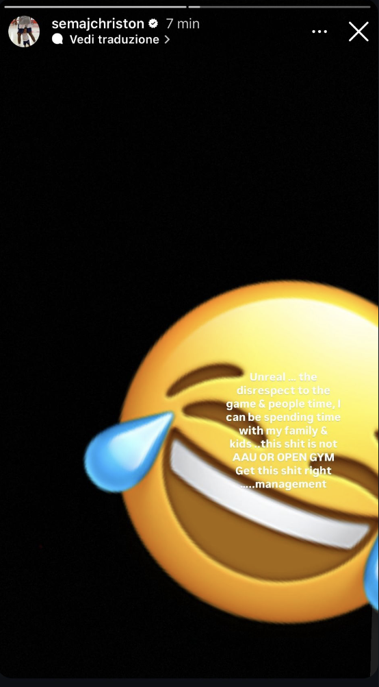 Ne ha dato conferma a tutti l’ultimo arrivato, nonché il più esperto del gruppo, Semaj Christon. Il play ex Brescia ha affidato alle proprie storie Instagram un pensiero sulla situazione vissuta in queste ore dai biancorossi. «La mancanza di rispetto nei confronti del gioco e del tempo delle persone è da non credere… Potrei piuttosto passare il tempo con la mia famiglia e i miei bambini… Questo campionato (Serie A, nda) non è l’AAU o l’open gym. La società deve porre rimedio a questa situazione». Pubblicata attorno alle 12:30 di martedì 29 ottobre, la storia è stata rimossa qualche ora dopo, nel tardo pomeriggio.