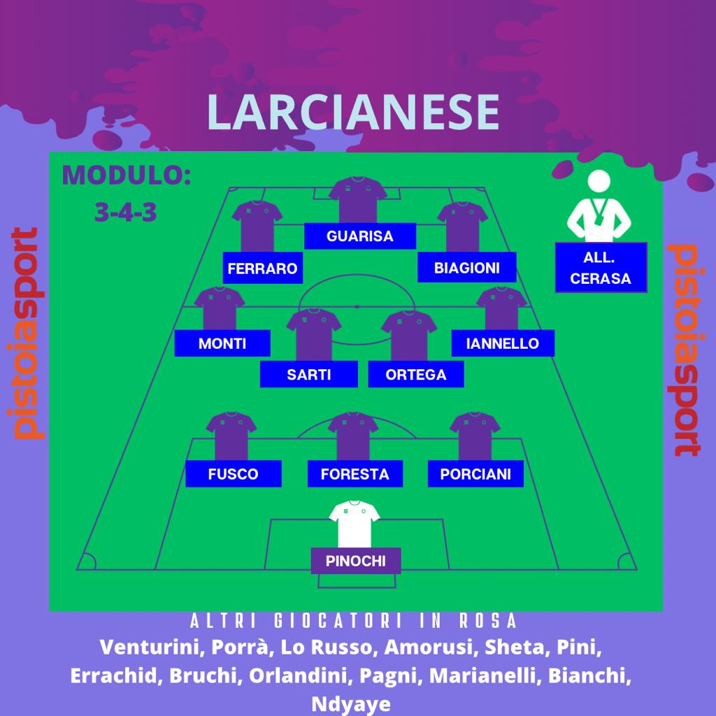 LARCIANESE (3-4-3): Pinochi; Porciani, Fusco, Foresta; Iannello, Ortega, Sarti, Monti; Biagioni, Guarisa, Iannello. A disposizione: Venturini, Porrà, Lo Russo, Amorusi, Sheta, Pini, Errachid, Bruchi, Orlandini, Pagni, Marianelli, Bianchi, Ndyaye. Allenatore: Cerasa