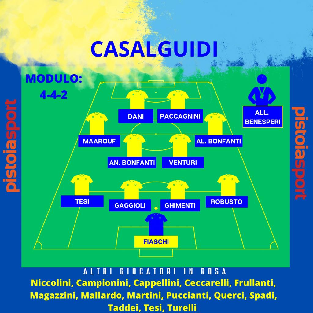 CASALGUIDI (4-4-2): Fiaschi; Robusto, Ghimenti, Gaggioli, Tesi; Alessandro Bonfanti, Andrea Bonfanti, Venturi, Maarouf; Paccagnini, Dani. A disposizione: Niccolini, Campionini, Cappellini, Ceccarelli, Frullanti, Magazzini, Mallardo, Martini, Puccianti, Querci, Spadi, Taddei, Tesi, Turelli. Allenatore: Benesperi