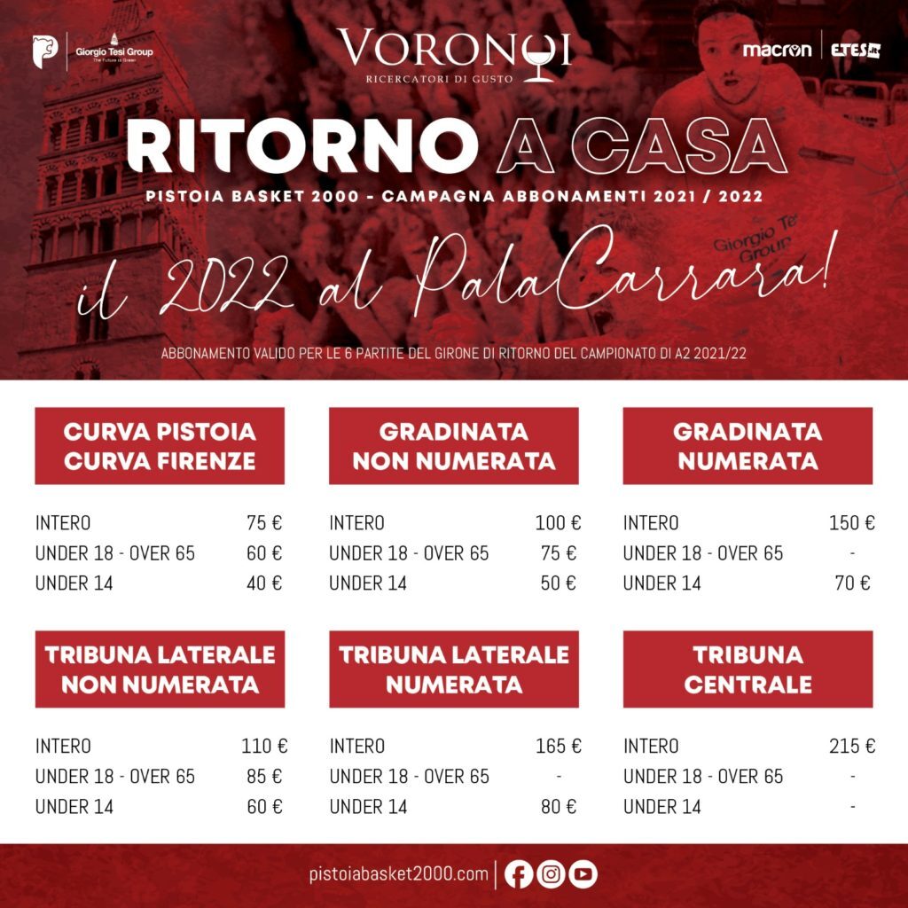 Altra iniziativa del Pistoia Basket per scaldare il PalaCarrara. Sta, infatti, per entrare nel vivo la campagna abbonamenti per seguire il girone di ritorno del campionato di serie A2 del Pistoia Basket 2000. Riapre dunque «Ritorno a casa», sponsorizzata per l’occasione da Voronoi, con una scontistica importante per le ultime sei gare di regular season al PalaCarrara e sostenere una squadra capace di chiudere il girone d’andata al secondo posto, con una Supercoppa in più in bacheca e la qualificazione alle F8 di Coppa Italia. Di seguito tutti i prezzi (ingresso gratuito per gli under 10, per accedere all’impianto sono necessari Green Pass rafforzato e mascherina FFP2).