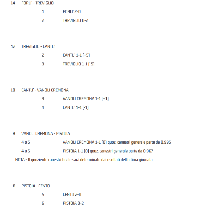 In caso di vittoria dei siciliani, ça va sans dire, la GTG Pistoia affronterebbe la truppa dell’ex Montecatini Giacomo Cardelli. Se a vincere sull’isola fossero i romagnoli (con la contemporanea sconfitta di Nardò) dipenderebbe invece tutto dallo scarto attivo che al momento recita +7 a favore di Agrigento.