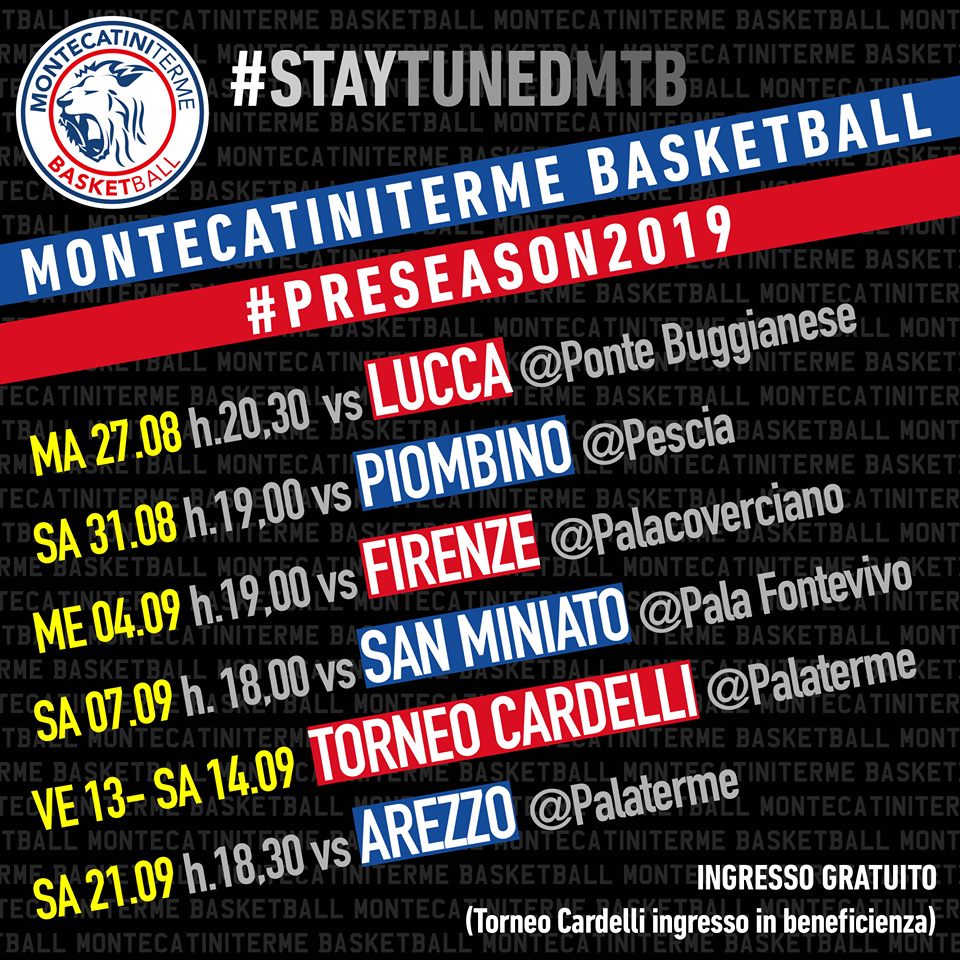Dopo essersi ritrovata lo scorso lunedì e in attesa dell’inizio del campionato, fissato per il 29 settembre in casa con Empoli, Montecatini sarà impegnata in alcune amichevoli di preparazione. Il primo appuntamento è per martedì 27 agosto (ore 20:30), quando i ragazzi di coach Alberto Tonfoni se la vedranno a Ponte Buggianese contro Lucca. Dopo le sfide con Piombino, Firenze e San Miniato, ecco l’appuntamento più atteso: il trofeo Cardelli al PalaTerme, dove saranno protagoniste anche Agliana, Firenze e San Miniato. L’ultimo impegno prima della partenza del campionato sarà invece contro Arezzo.