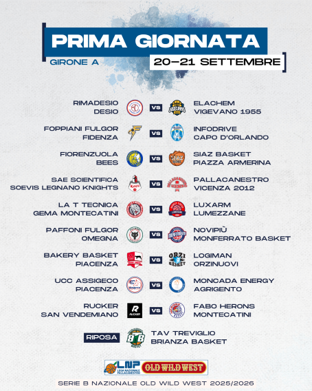 La Lega Nazionale Pallacanestro ha ufficializzato la prima giornata del campionato di Serie B Nazionale 2025/26 in cui saranno protagoniste ben tre squadre della nostra provincia. Le sfide si giocheranno nel weekend di sabato 20. domenica 21 settembre, con orario da definire.