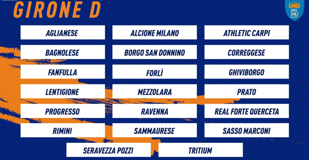Spicca invece la presenza di tre formazioni lombarde le quali rappresentano una novità per il Girone D. La realtà più conosciuta è certamente quella del Tritium, compagine di Trezzo sull’Adda, che vanta anche apparizioni recenti in Serie C. Le altre due squadre rispondono al nome di Alcione Milano e Fanfulla, che pone le proprie radici nella provincia di Lodi. Sono stati sorteggiati anche gli accoppiamenti per il turno preliminare di Coppa Italia Serie D, in programma domenica 12. L’Aglianese non scenderà in campo e farà il suo debutto mercoledì 22 contro la vincente tra Poggibonsi e Scandicci.