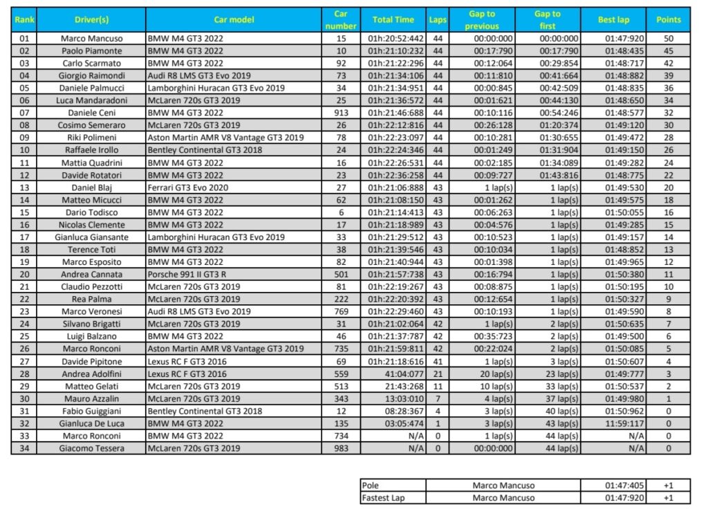 Daniele infatti ha corso una seconda parte di GP tutta all’attacco per recuperare, nei confronti di Scarmato, il terzo posto che occupava prima dei pit stop e perciò ha pagato un errore nel rabbocco del carburante in griglia di partenza. Negli ultimi due giri la sua Lamborghini ha per forza di cose rallentato e Palmucci ha dovuto farsi sfilare prima dal penalizzato Ceni e poi da Raimondi, fermandosi appena dopo la linea del traguardo. Un errore che di certo avrà fatto scuola e che comunque poteva pagare molto di più. Si conferma infine in top 5 Luca Mandaradoni, buon sesto a Monza con una McLaren in discreta forma.