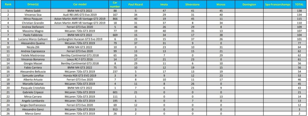 Capitolo da dimenticare anche per Mirco Pasquon, classificatosi quindicesimo dopo il ritiro a nove tornate dalla fine. Il passo falso costa caro al portacolori dell’Aston: dal comando nella Class 3 è adesso in terza posizione a due round dal termine. Monza amara anche per Andrea Stefanoni, uscito ad inizio GP, e Massimo Magno, quattordicesimo a due giri nonostante il giro più veloce in gara. Sorride invece Paolo Fabbrizio, al primo podio stagionale dopo essere partito dalla pole. Il terzo posto di Monza significa infatti settima posizione nel campionato. Fuori dal podio di tappa, seppur per soli 6”, Christian Grandin che comunque resta vicino al podio (5 lunghezze).