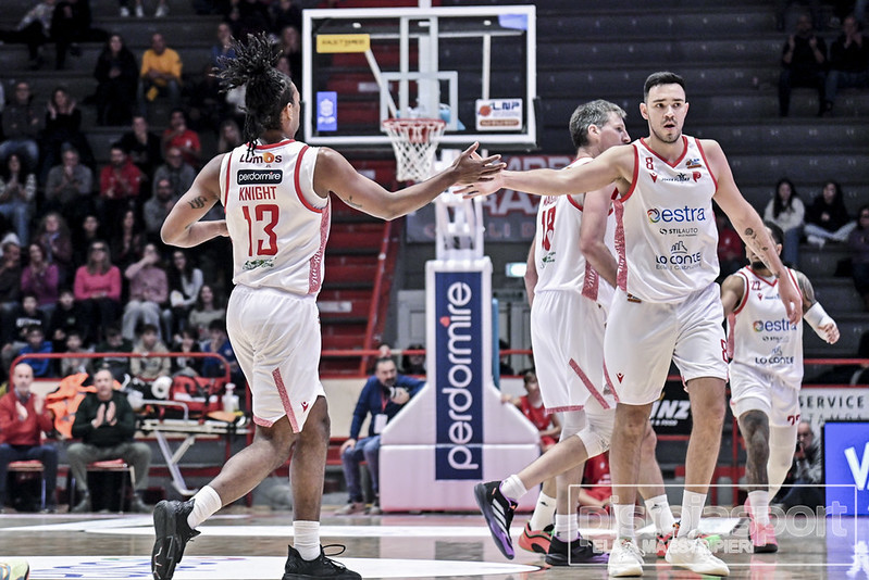 Dall’altra parte del campo va detto, invece, che i biancorossi sono stati particolarmente incostanti, con l’ultimo successo contro Cento a rappresentare un altro minimo ed incoraggiante segnale. I 91 punti messi a segno (figli in effetti di un primo tempo record da 50 punti) sono il secondo miglior score di questa stagione, dietro solamente ai 93 registrati nel successo con Bergamo e a pari merito con la vittoria in quel di Torino. Ma, più che la capacità realizzativa in toto, ad interessare è un altro aspetto. Coach Sacripanti ha parlato espressamente della necessità di trovare più alternative nel gioco offensivo, provando a non ricorrere eccessivamente alle soluzioni dal perimetro. Ecco che la sfida di domenica ha portato in dote anche la miglior percentuale stagionale dal pitturato: 65% di squadra. L’Estra ha oggettivamente tentato di più da due (46 tiri presi) e anche realizzato di più (30 mandati a bersaglio). In particolare Jazz Johnson e Seneca Knight hanno saputo esaltarsi in avvicinamento a canestro, così come, a seguire, anche capitan Saccaggi e Zanotti.