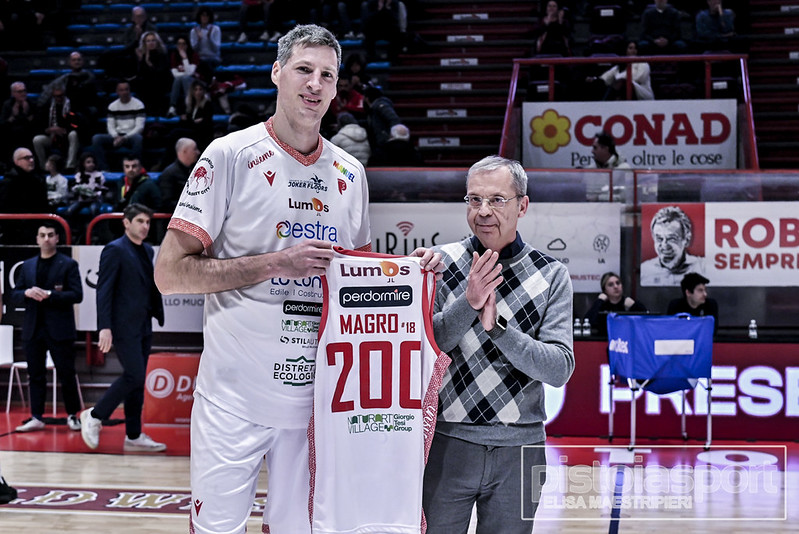La storia di Daniele Magro con il Pistoia Basket si arricchisce di un nuovo straordinario traguardo. Il centro padovano, alla sua quarta diversa esperienza in biancorosso, ha raggiunto le 200 presenze con il club, iscrivendosi al ristretto club dei cestisti ad aver toccato questa quota. Nonostante le 38 primavere, Magro anche quest’anno si sta ritagliando uno spazio importante nel roster, con ampio minutaggio e qualità immutate vicino al ferro. Prima della palla a due con Ruvo di Puglia, “Pippo” si è goduto gli applausi dei propri tifosi e la maglia celebrativa, non potendo purtroppo festeggiare allo stesso modo nel finale, vista la sconfitta dell’Estra.